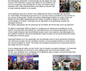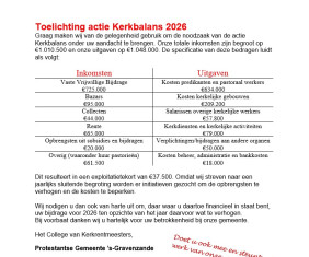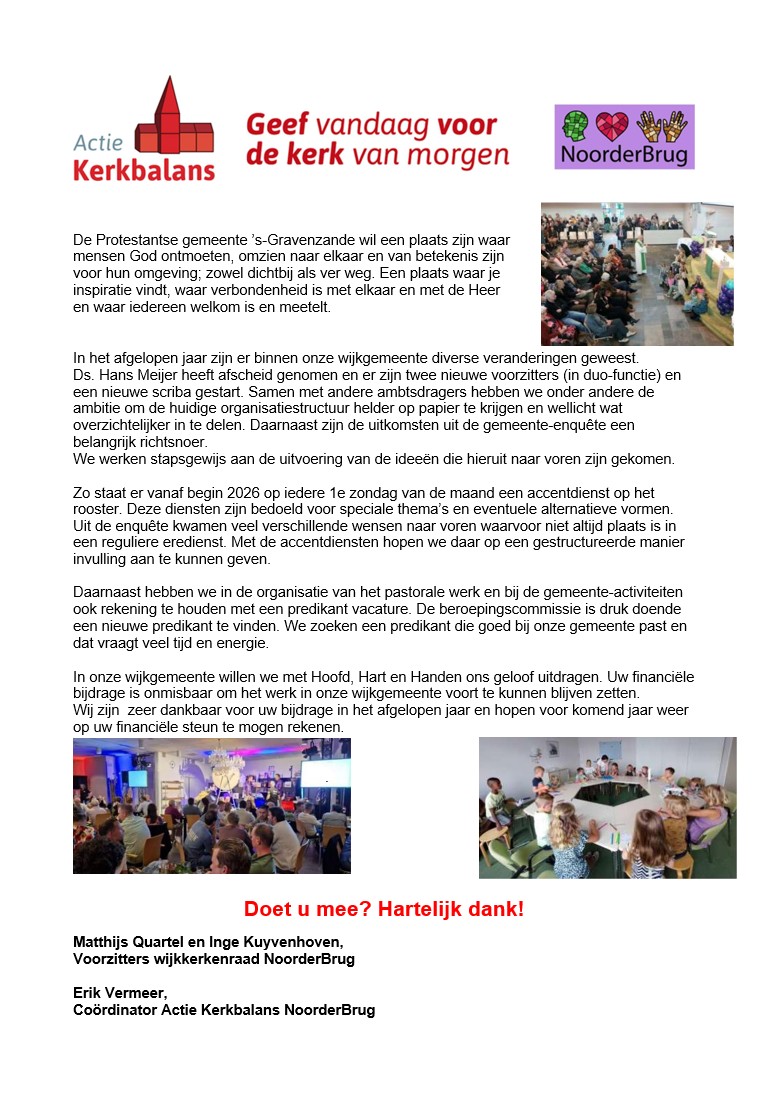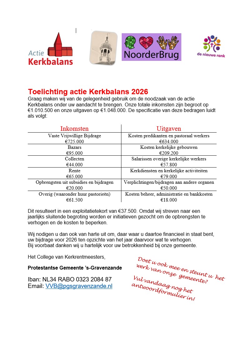 Actie Kerkbalans is de jaarlijkse actie waarbij aan leden van de kerk wordt gevraagd een financiële bijdrage te geven voor het unieke werk onze kerk. Mede door Actie Kerkbalans kan de Protestantse Gemeente ‘s-Gravenzande haar positieve bijdrage blijven leveren in het dorp.
