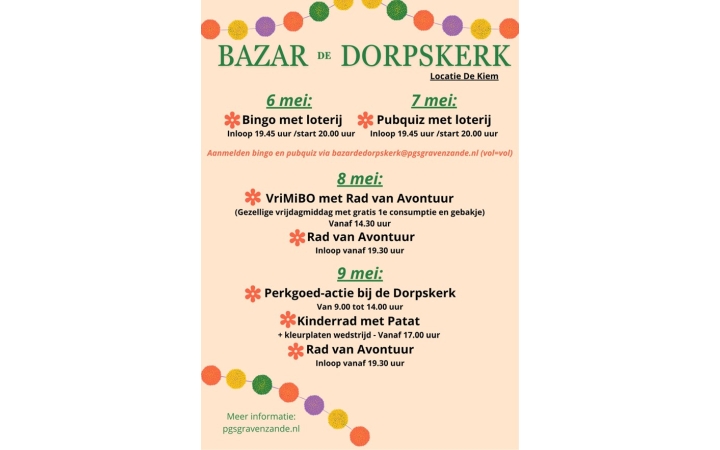 In de week van 4 mei (vlak voor Moederdag, zondag 10 mei) is het weer feest in De Kiem: we organiseren opnieuw onze gezellige Bazar. Hieronder vind je het programma in het kort.