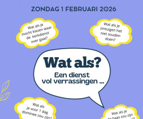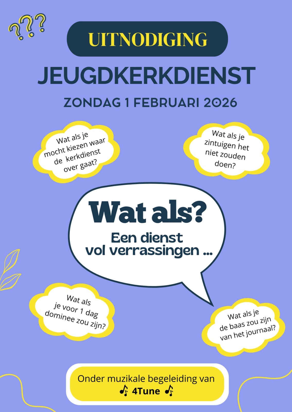Op zondag 1 februari wordt er om 10:00 uur een jeugdkerkdienst gehouden in de Noorderkerk met het thema ‘Wat als…’. Verwacht een sprankelende dienst vol verrassingen vóór en dóór de jeugd! Uiteraard is ook de ‘iets oudere’ jeugd van harte welkom. De muzikale invulling wordt verzorgd door de band 4Tune en voorganger tijdens deze dienst is ds. Hedy Cappon.
