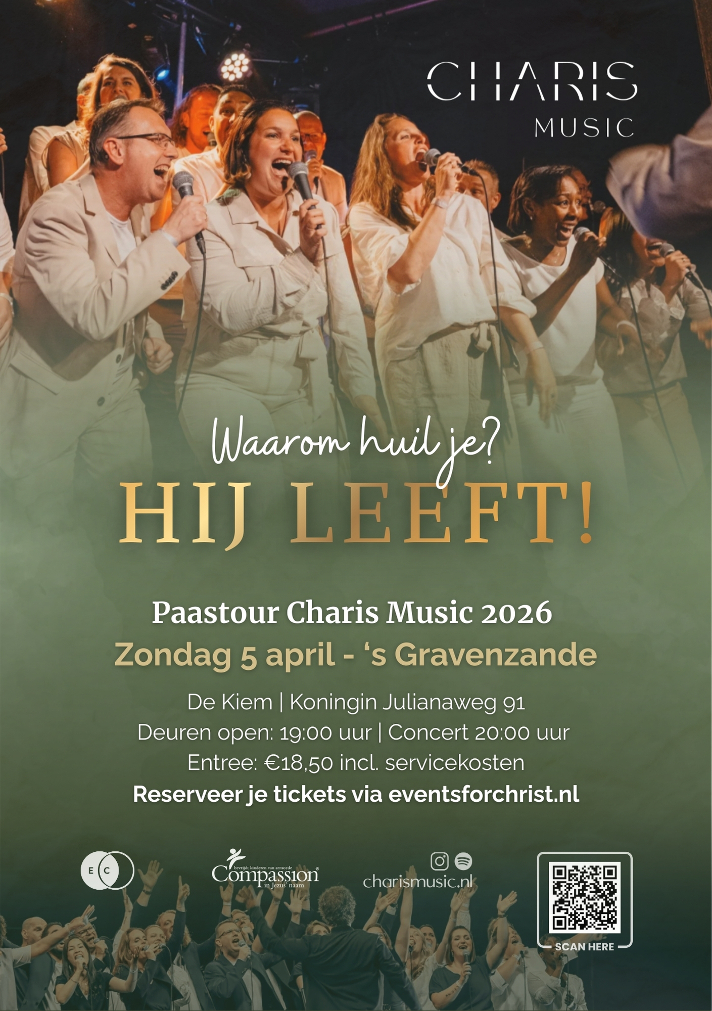 Onder de titel “Waarom huil je? Jezus leeft!” nodigt Charis Music iedereen uit om samen stil te staan, te luisteren, te zingen en te beleven. Muziek en woorden geven ruimte aan kwetsbaarheid, maar ook aan hoop. Met prachtige luisterliederen, krachtige gospels en samenzang wordt het een avond die de kern van Pasen raakt en tegelijk dichtbij komt in ons eigen leven.