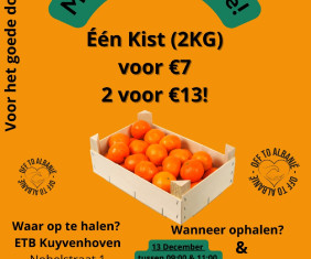 U kunt de kistjes met mandarijnen ophalen op 12 december tussen 12.00 en 14.00 uur en op 13 december tussen 09.00 en 11.00 uur bij ETB Kuyvenhoven, Nobelstraat 1, 2693 BC 's-Gravenzande